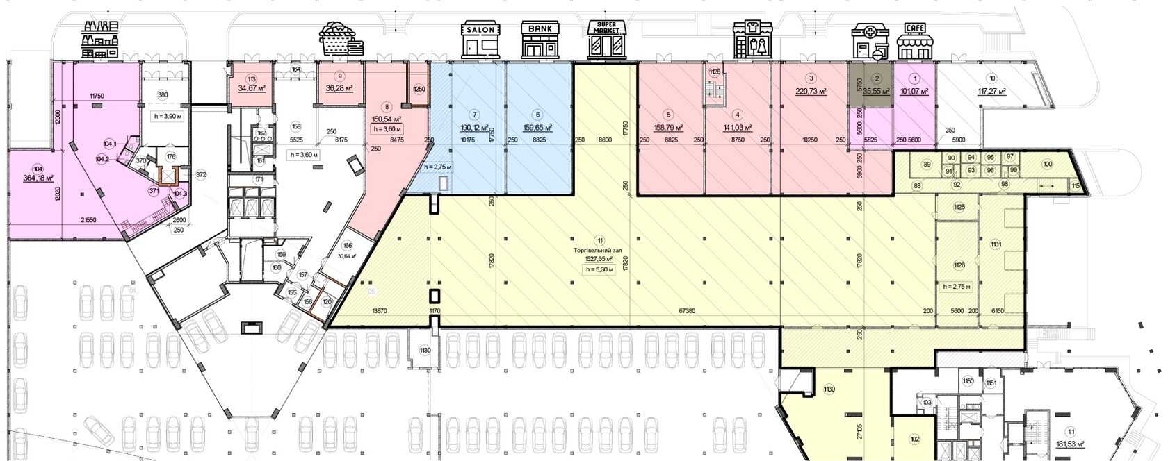 Розташовані на першому поверсі стилобату і фасадом виходять на основну транспортну магістраль Дніпра вул. Набережна Перемоги.